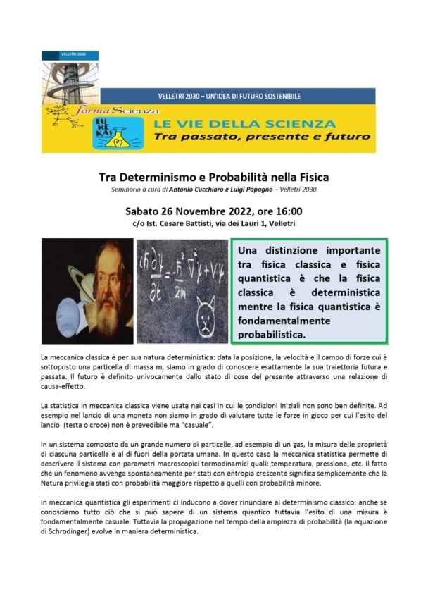 Si terrà sabato 26 novembre alle ore 16:00 il primo Seminario del ciclo 2022 – 2023 “le vie della scienza“; ciclo che annualmente caratterizza le attività divulgative del pensiero scientifico, ideato e programmato dall’Associazione Velletri 2030. Come per il passato, il ciclo di Seminari sarà tenuto in presenza e sarà ospitato dall’Istituto di Istruzione Superiore Statale “Cesare Battisti” nella sua sede di via dei Lauri 1. Titolo del Seminario è “tra Determinismo e Probabilità nella Fisica”, relatori Antonio Cucchiaro e Luigi Papagno, vedere Locandina allegata.
