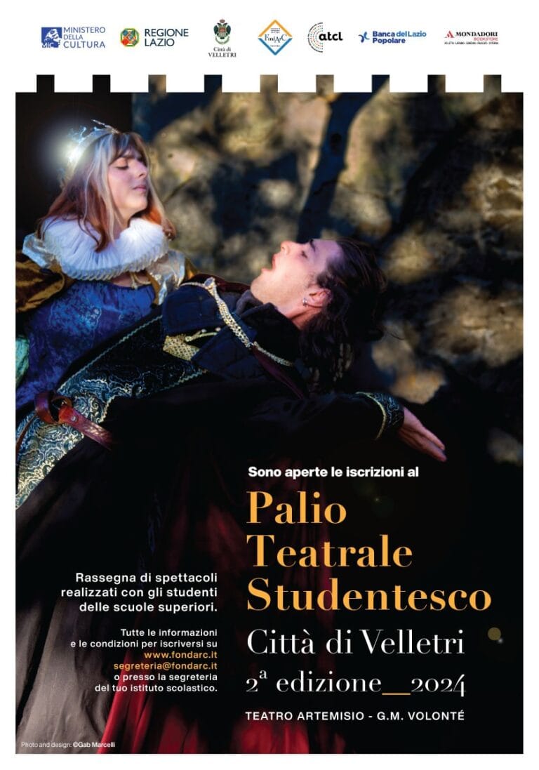 • Torna, con l’attesissima seconda edizione, il Palio Teatrale Studentesco “Città di Velletri” – rassegna di spettacoli a cui possono partecipare gli allievi di tutte le scuole medie superiori del territorio – organizzato dalla Fondazione di Partecipazione Arte & Cultura Città di Velletri diretta da Giacomo Zito con il patrocinio di Ministero della Cultura, Regione Lazio, Comune di Velletri, con la collaborazione di ATCL (Associazione Teatrale Comuni del Lazio) e Mondadori Bookstore Velletri e il contributo di Banca Popolare del Lazio.