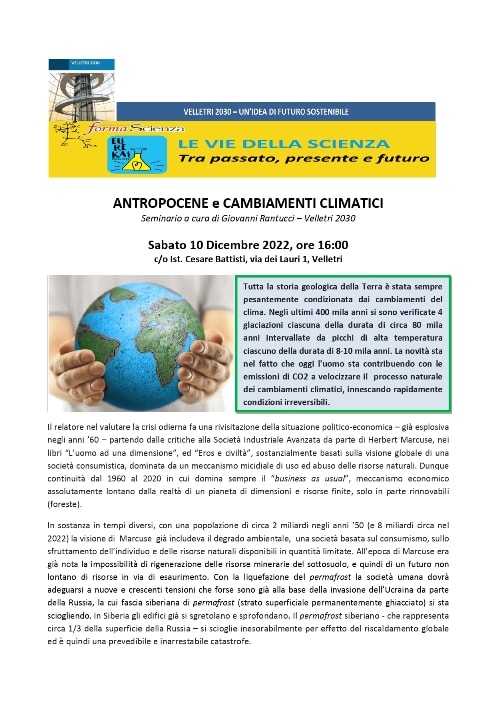 • Si terrà sabato 10 dicembre alle ore 16:00 il secondo Seminario del ciclo 2022 – 2023 “le vie della scienza“; ciclo che annualmente caratterizza le attività divulgative del pensiero scientifico, ideato e programmato dall’Associazione Velletri 2030. Come per il passato, il Seminario sarà tenuto in presenza e sarà ospitato dall’Istituto di Istruzione Superiore Statale “Cesare Battisti” nella sua sede di via dei Lauri 1. Titolo del Seminario è “Antropocene e Cambiamenti Climatici”, relatore Giovanni Rantucci, vedere Locandina allegata.