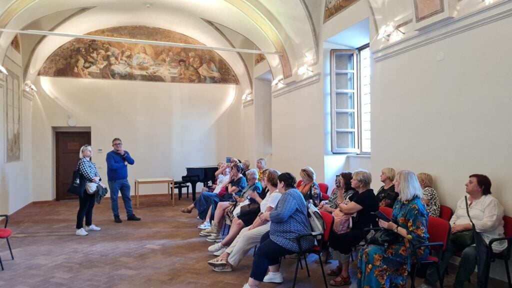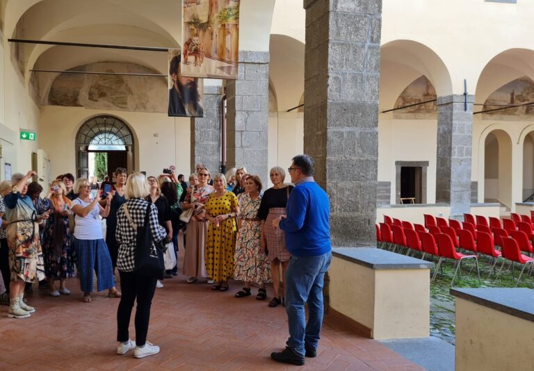 La delegazione si è quindi spostata a Velletri, dove il Direttore, Leonardo Ciocca, li ha accolti nella sala del refettorio dell’ex Convento del Carmine – oggi Casa delle Culture e della Musica – che, a seguito del restauro ultimato nel 2016, ospita attualmente la biblioteca comunale; ammirati dalla luminosità dei locali e dallo splendido panorama sul Monte Artemisio, i bibliotecari lituani hanno concluso la visita con la visione del magnifico mosaico romano conservato nel Chiostro.