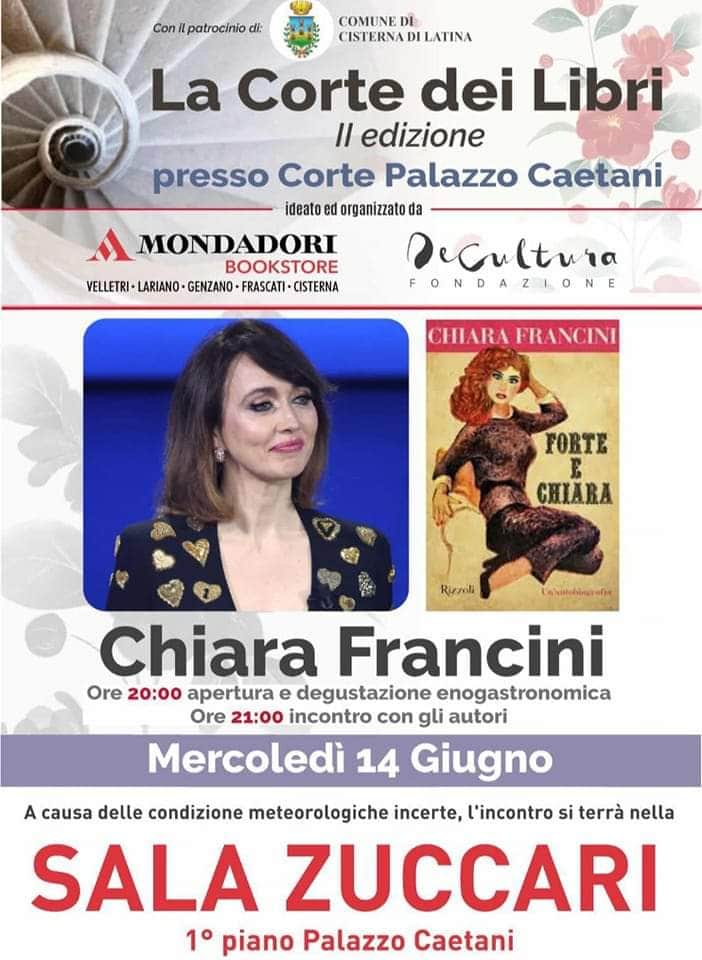 Torna a Cisterna di Latina il festival letterario “La Corte dei Libri”. La seconda edizione, patrocinata dall’Amministrazione Comunale e ideata e realizzata dalla Mondadori Bookstore Cisterna e dalla Fondazione De Cultura, inizierà mercoledì 14 giugno presso la Sala Zuccari (al primo piano di Palazzo Caetani) con un’ospite d’eccezione: Chiara Francini.