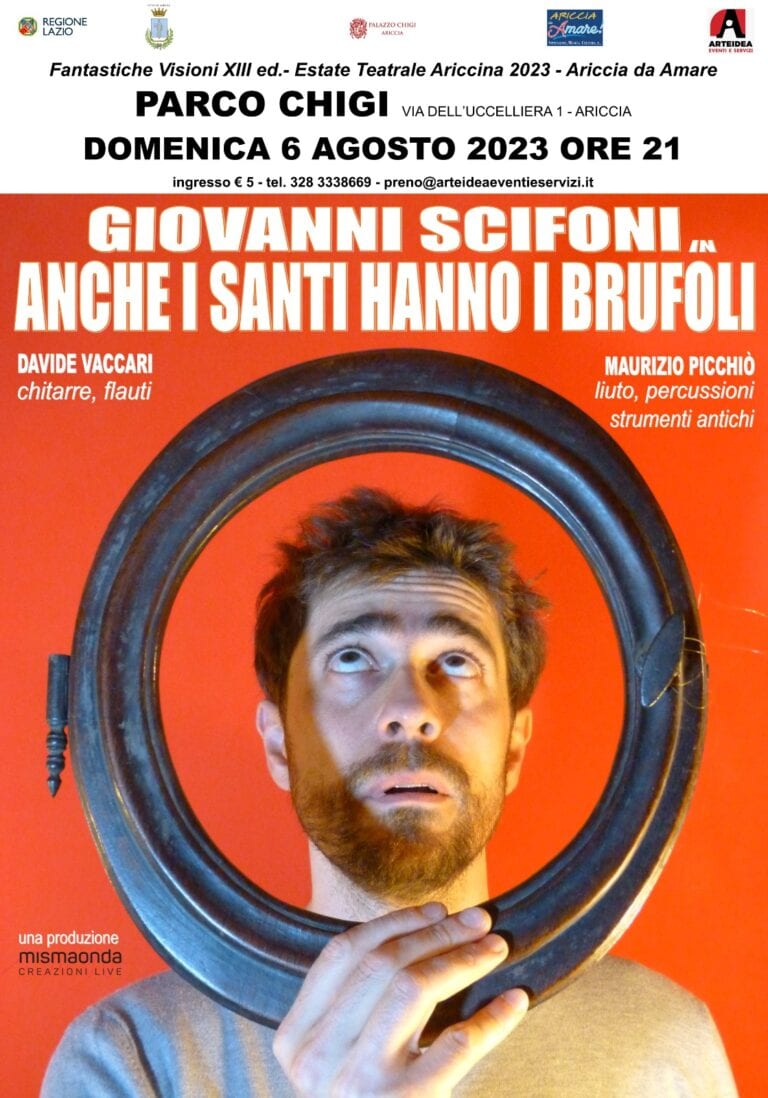 Anche i santi hanno i brufoli” è un racconto giullaresco dove l’attore e scrittore Giovanni Scifoni, accompagnato dai musicisti Davide Vaccari e Maurizio Picchiò, con il linguaggio divertente che lo contraddistingue, riporta ai giorni nostri le vicende dei santi del passato: San Giovanni Bosco, Sant’Agostino, San Giovanni di Dio, Santa Francesca Romana. A volte sembra che Dio lo faccia apposta: si sceglie le persone peggiori per compiere le sue grandi opere, e forse lo fa apposta, per rendere evidente che sicuramente è merito suo. Spesso i santi sono persone senza qualità, senza talento, che ricevono una proposta: vuoi fare questa cosa? Non sei capace a farla e sicuramente sarà un disastro. Ti va? Le risate sono garantite.