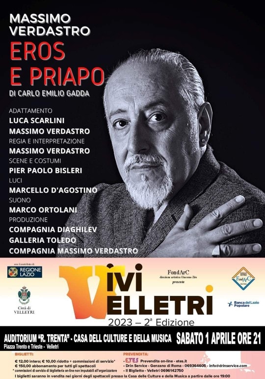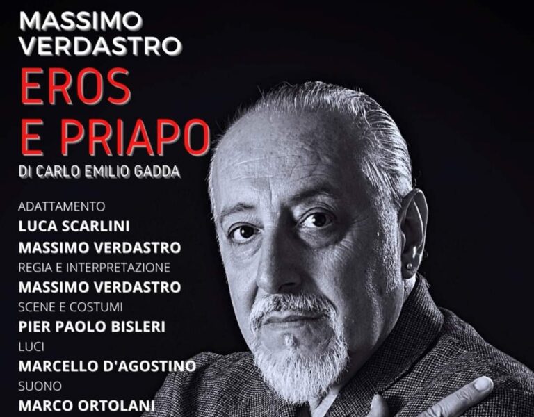 “Eros e Priapo” è uno spettacolo con Massimo Verdastro, adattamento di Luca Scarlini e Massimo Verdastro, scene e costumi di Pier Paolo Bisleri, luci di Marcello D’Agostino, suono di Marco Ortolani, produzione Compagnia Diaghilev, Galleria Toledo, Compagnia Massimo Verdastro. Regia di Massimo Verdastro. Biglietto intero 12 euro, ridotto 10, abbonamento intera rassegna 150 euro. Prevendita presso Il Biglietto Velletri (Via Eduardo De Filippo, 99), Drin Service Genzano (Via Galieti, 10), on line su ETES, il giorno dello spettacolo dalle 19 presso la Casa delle Culture e della Musica.
