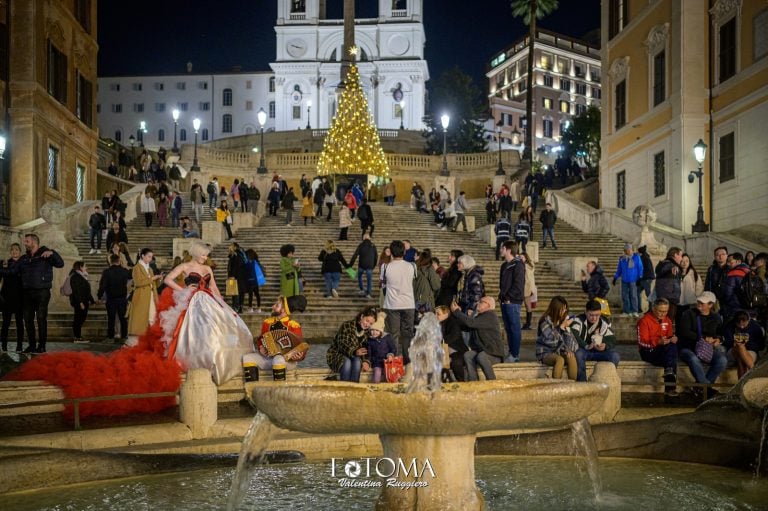 Per Natale Egi_stella voleva regalare al suo pubblico un’atmosfera magica, istanti di amore e bellezza senza tempo, voleva far immergere le persone in una favola, e quale miglior location se non quella di una delle più importanti piazze di Roma. Ha quindi cucito (da autodidatta) un grandissimo abito rosso di tulle formato da una coda di circa 3 metri e mezzo con una cascata di rose rosse, utilizzando quasi 70 metri di stoffa.