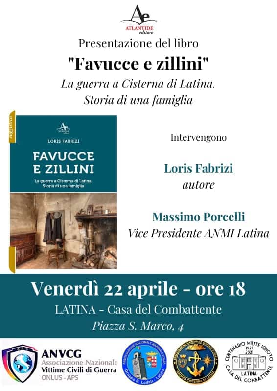 Loris Fabrizi, medievista, attore e drammaturgo, scrittore nonché “conduttore” della ormai nota rubrica letteraria LT-CULT — che propone in diretta, sulla pagina Facebook di Radio Web Latina, interviste inerenti al mondo dei libri e dell’editoria in provincia di Latina — presenterà il suo “Favucce e zillini. La guerra a Cisterna di Latina. Storia di una famiglia” il prossimo 22 aprile 2022, alle ore 18.00 presso la Casa del Combattente, in piazza San Marco, 4. L’incontro è organizzato da Atlantide Editore in collaborazione con l’Associazione Nazionale Vittime Civili di Guerra e l’Associazione Nazionale Marinai d’Italia (Gruppo “R. Lodati” – Latina e Gruppo Cisterna di Latina). A dialogare con l’Autore sarà Massimo Porcelli, Vice Presidente dell’ANMI Latina.