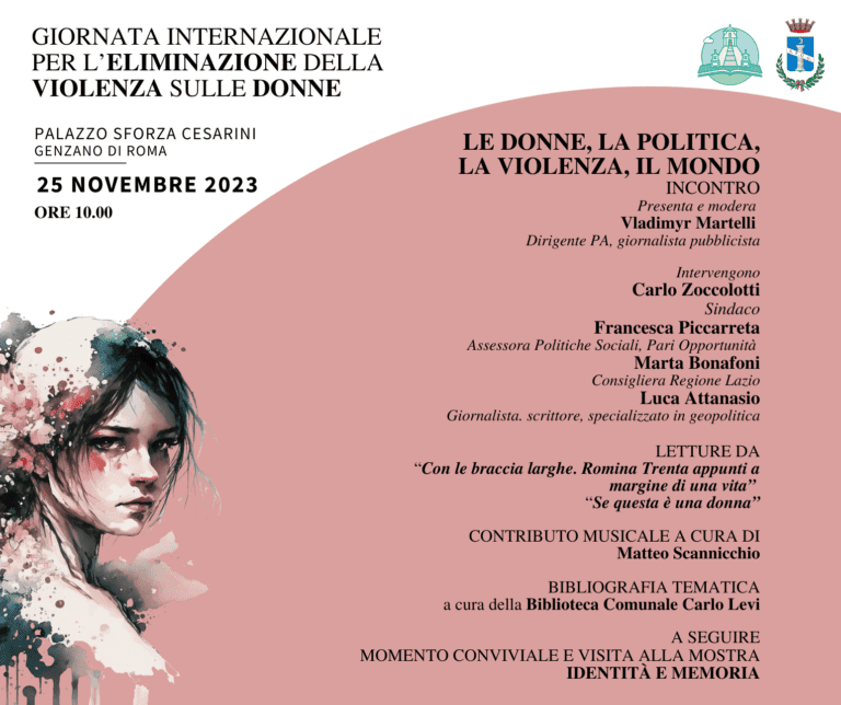 Sabato 25 novembre 2023 dalle ore 10 alle ore 13 presso il Comune di Genzano, Palazzo Sforza Cesarini, ci sarà un incontro per la Giornata Internazionale per l’eliminazione della violenza sulle donne, dal titolo “Le donne, la politica, la violenza, il mondo”. L’occasione è quella di riflettere, anche dopo i fatti tragici di questi giorni con i continui femminicidi tra i quali quello di Giulia Cecchetin, su quello che stiamo vivendo con uno sguardo che tiene conto anche del mondo. Per questo motivo si parlerà di donne e politica, ricordando l’impegno di tante per le pari opportunità per la lotta al femminicidio, per una cultura inclusiva; e tra queste si ricorderà l’impegno al riguardo dell’Assessore del Comune di Velletri Romina Trenta scomparsa il 2 gennaio 2022 per una grave malattia. Si parlerà di donne e violenza nel mondo, di storie di tante che con forza, coraggio e sofferenza lottano per avere un futuro migliore. Si parlerà anche di uomini e di quello che sono chiamati a fare.