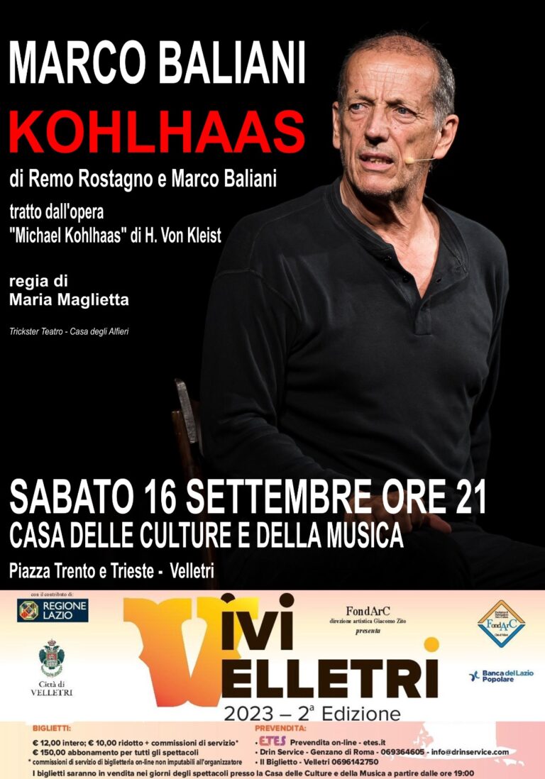 • Si concluderà con “Kohlhaas’ e l’esibizione di Marco Baliani, per un testo di Remo Rostagno e Marco Baliani tratto dall’opera “Michael Kohlhaas” di Heinrich Von Kleist, la rassegna culturale “Vivi Velletri”.