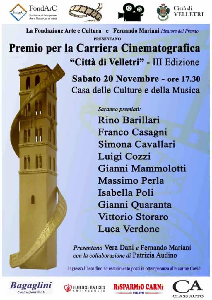Torna il Premio alla Carriera Cinematografica “Città di Velletri”, ideato da Fernando Mariani e realizzato quest’anno per la sua terza edizione dalla Fondazione di Partecipazione Arte & Cultura Città di Velletri diretta dal Maestro Claudio Maria Micheli e da Fernando Mariani. Tantissimi i nomi dei premiati, che come di consueto rappresentano tutte le categorie lavorative del mondo del cinema.
