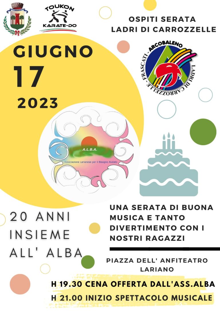 Sabato 17 giugno prossimo, a Lariano, una serata di buona musica e tanto divertimento con i ragazzi dell’Associazione A.L.B.A.. Nella centralissima piazza dell’Anfiteatro, a partire dalle 19.30, si festeggeranno i venti anni dell’Associazione. Ospiti della serata i “Ladri di Carrozzelle” e gli atleti del Toukon Karate-Do. I “Ladri di Carrozzelle” sono una band musicale rock attiva dal 1989 e con un percorso costellato di successi comprese le partecipazioni al Primo Maggio e al Festival di Sanremo. Il Toukon, invece, è una prestigiosa associazione sportiva che ha raggiunto negli ultimi anni traguardi internazionali di altissimo livello. Alle 19.30 avrà luogo la cena offerta dall’Associazione A.L.B.A., alle 21.00 invece spazio allo spettacolo musicale. “Noi tutti, a nome dell’Associazione A.l.b.a., possiamo dire con orgoglio ed immensa felicità di aver raggiunto il traguardo dei nostri primi 20 anni insieme. La nostra associazione opera sul territorio al fine di abbattere ogni barriera di diseguaglianza rendendoci tutti, indistintamente liberi di essere ciò che siamo. Vi aspettiamo per festeggiare insieme il 17 giugno presso l’anfiteatro di Lariano!”, ha dichiarato la presidente Paola Stazi, per invitare tutti i cittadini a partecipare. L’appuntamento è dunque per sabato 17 giugno, ore 19.30, in Piazza dell’Anfiteatro.