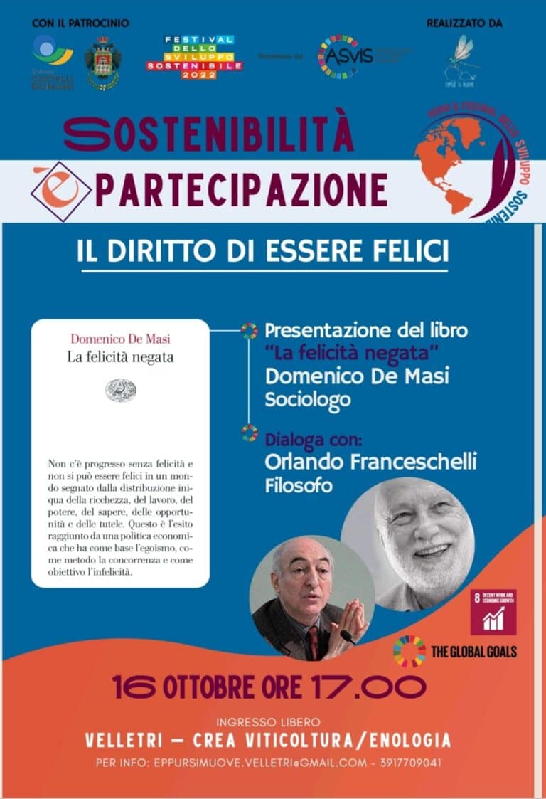 Domenica 16 ottobre, sempre alle ore 17.00, il Festival si sposta a Velletri per concludere questo ricco e interessante percorso fatto di quattro date e una miriade di argomenti affrontati sempre nell’ottica della sostenibilità. L’evento di chiusura si svolgerà a Velletri presso il CREA Viticoltura-Enologia (ex Cantina Sperimentale) con un convegno-dibattito dal titolo “La felicità negata” intorno a tutti gli obiettivi dell’Agenda 2030, con particolare attenzione per il numero 8 (lavoro dignitoso e crescita economica). Domenica 16 ottobre, dalle ore 17.00, il filosofo Orlando Franceschelli e il sociologo Domenico De Masi daranno una panoramica su tanti di quei concetti spesso ritenuti astratti nella vita reale e invece terribilmente aderenti alla sfera intima di ogni singolo cittadino. L’evento del CREA chiuderà l’esperienza di “Sostenibilità è partecipazione”, in una splendida cornice che ben si presta a un argomento tanto spinoso quanto urgente come il diritto alla felicità.