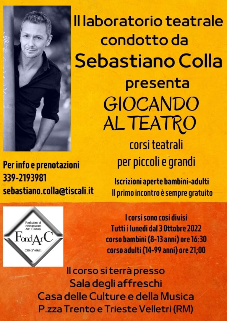 • Laboratorio teatrale per grandi e per bambini, diretto dall’attore professionista Sebastiano Colla, a Velletri. I corsi si terranno tutti i Lunedi del mese a partire da Lunedì 3 ottobre presso la Sala degli Affreschi della Casa delle Culture e della Musica a Velletri in Piazza Trento e Trieste. Per qualsiasi informazione si può telefonare al numero 3392193981.
