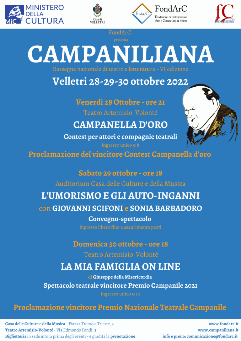La “Campaniliana”, rassegna nazionale di teatro e letteratura, torna a Velletri con un format rinnovato per la sesta edizione. Anche questa volta l’organizzazione è a carico della Fondazione di Partecipazione Arte & Cultura Città di Velletri, diretta da Giacomo Zito, con il patrocinio del Comune di Velletri e la collaborazione del Fondo Achille Campanile. La manifestazione si svolgerà il 28, 29 e 30 ottobre 2022 tra la Casa delle Culture e della Musica e il Teatro Artemisio-Volonté. Esibizioni teatrali, convegni, spettacoli, le proclamazioni dei vincitori del premio e del contest fra le tantissime novità messe in campo dal Comitato Scientifico, composto da Giacomo Zito, attore, doppiatore e regista nonché direttore artistico della Fondazione, Rocco Della Corte, giornalista e scrittore, Gaetano Campanile, figlio dell’autore e referente del Fondo.
