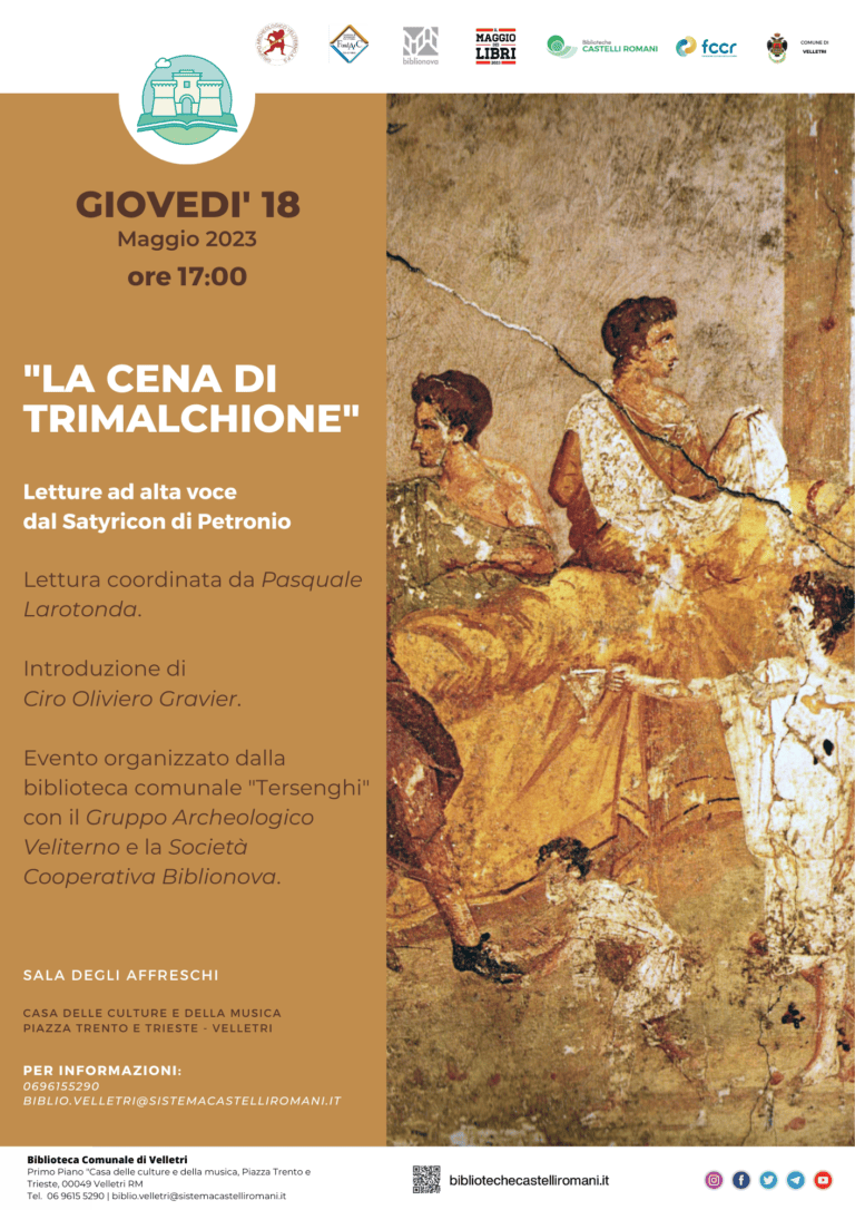 Giovedì 18 maggio 2023, alle ore 17.00, la Biblioteca comunale di Velletri “Augusto Tersenghi” in collaborazione con il G.A.V. (Gruppo Archeologico Veliterno) e la Società Cooperativa Biblionova, presenta l’evento “La cena di Trimalchione. Lettura ad alta voce dal Satyricon di Petronio”.