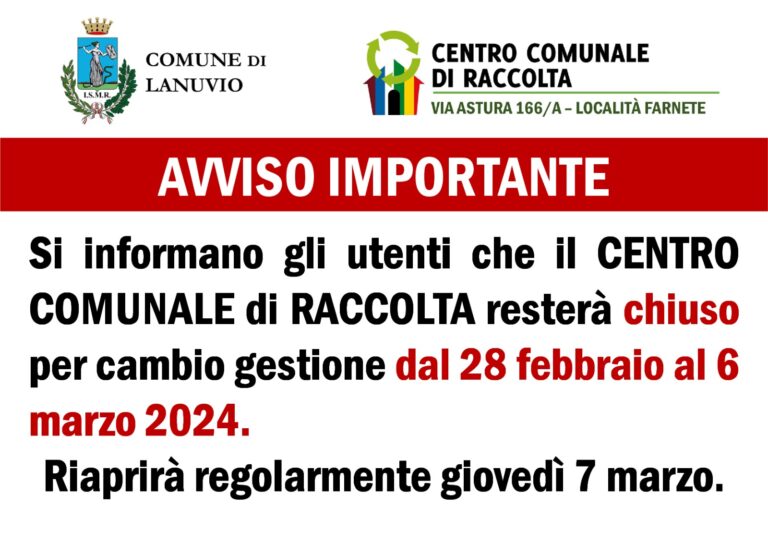 L’amministrazione informa i cittadini che dal 28 febbraio al 6 marzo (compreso) il centro di raccolta sarà chiuso per lavori di adeguamento e manutenzione. Le modifiche al piano di ritiro avverranno in modo graduale e nel frattempo, finchè non vi saranno comunicazioni puntuali, i servizi e gli orari resteranno gli stessi.