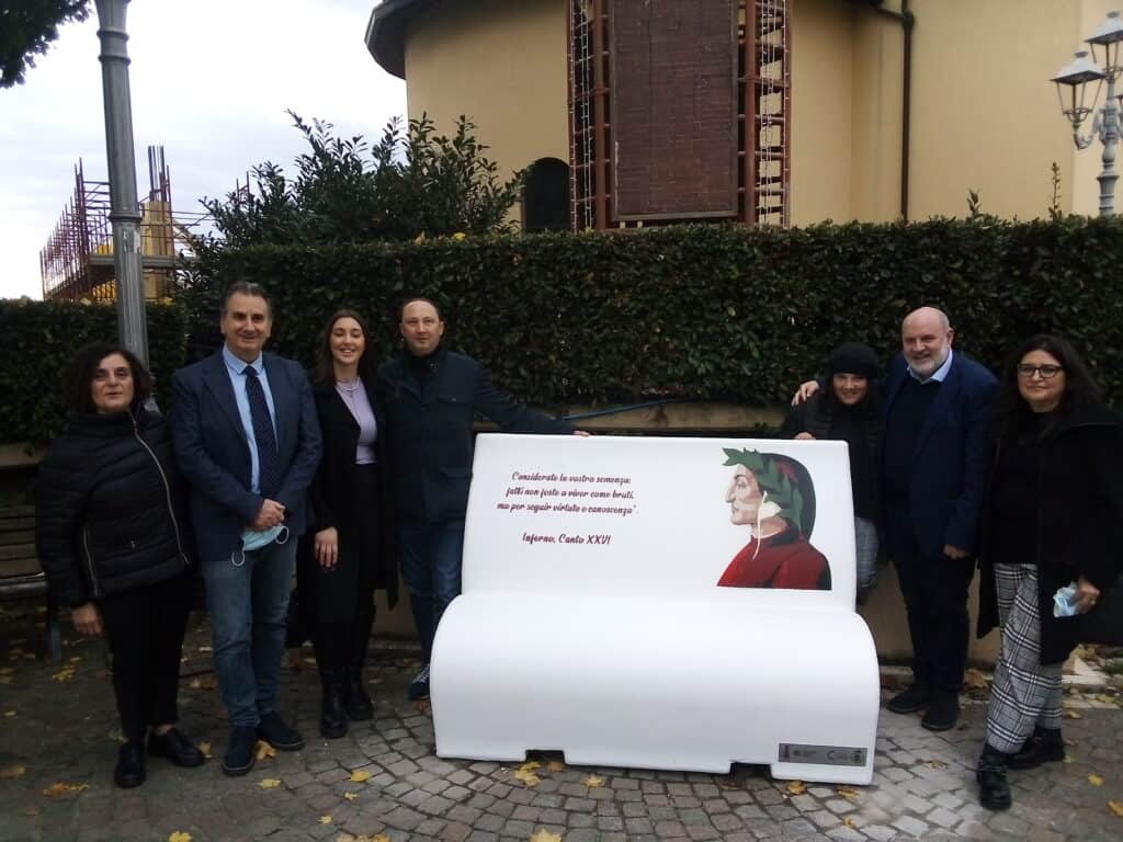Nell’ambito del progetto “Eterno Dante”, promosso da “I Castelli della Sapienza”, Regione Lazio e Lazio Crea in collaborazione con la Fondazione De Cultura, a piazza S. Eurosia è stata scoperta la nuova panchina dal particolare design a forma di libro. Presenti il Sindaco, Maurizio Caliciotti, che ha definito adatta alla comunità la terzina scelta, quella con le note parole di Ulisse (“Fatti non foste a viver come bruti…”).