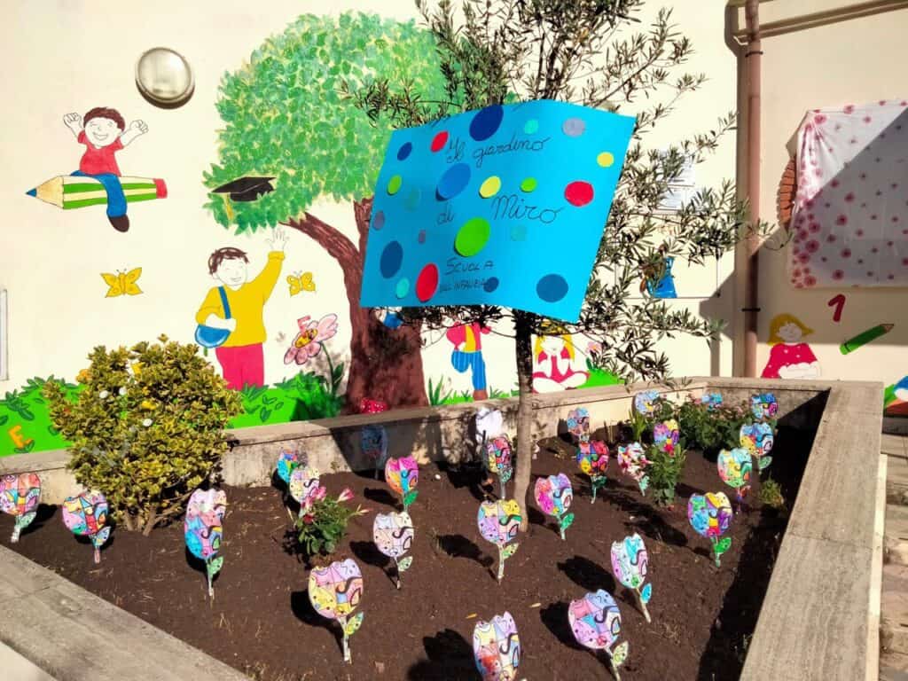 I ragazzi delle quinte classi della scuola primaria hanno allietato l’evento urlando a gran voce l’inno della scuola e l’intramontabile canzone di John Lennon, “Imagine”. In concomitanza con l’inaugurazione del mosaico e, a conclusione del progetto “Zarfati Art”, è stata aperta la mostra dedicata all’artista spagnolo Joan Mirò, conosciuto e amato dagli alunni per le sue potenzialità espressive. I bambini dell’infanzia, così, ne hanno apprezzato i colori e le sue forme semplici, realizzando dei vivaci fiori ispirati alle sue opere, collocati in giardino, all’ingresso della mostra. Gli alunni della scuola primaria, invece, dopo aver visto i video e sperimentato varie tecniche, hanno dipinto 10 tele, una per classe, per riprodurre le opere più famose di Joan Mirò. Sono stati tanti e grandi gli apprezzamenti e i riconoscimenti da parte dei genitori che, in questi ultimi giorni di scuola, hanno avuto la possibilità di visitare la mostra.