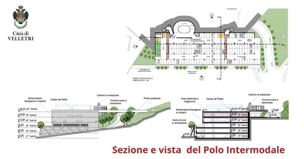 Si parte dalla costruzione di un Polo Intermodale, una struttura di cinque piani nella zona dell’attuale parcheggio in via Madre Teresa di Calcutta (vicino all’ospedale), sfruttando la disposizione del terreno, il progetto risulta poco impattante con un edifico che ospiterà 400 posti auto oltre a una serie di servizi che migliorano l’accessibilità e la mobilità. Infatti un piano sarà dedicato alla logistica con la possibilità di smistare le merci tra mezzi più grandi e mezzi più piccoli alimentati elettricamente per evitare che il centro venga invaso da mezzi grandi e impattanti. Inoltre sono previsti una serie di locali da destinare alle attività ricreative compreso un campo da paddle e spazi dove sarà possibile svolgere attività culturali. La struttura sarà poi collegata con la Villa attraverso un ponte pedonale che è l’inizio del percorso che conduce direttamente in centro. Il costo del Polo è di 5 milioni di euro.