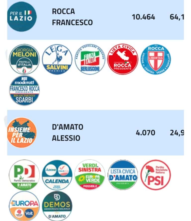 Francesco Rocca ha vinto, beneficiando delle ottime prestazioni di Fratelli d’Italia. Anche lui ha fatto peggio di Parisi cinque anni fa. La sostanza, però, è che il centrodestra prende sempre gli stessi voti. 934mila oggi con Rocca, 964mila 5 anni fa con Parisi. Prendere 30mila voti in meno è irrilevante quando il tuo competitor ne prende 600mila in meno.