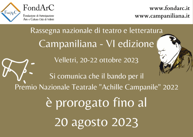 • La Fondazione, come di consueto, ha indetto la settima edizione del concorso –Premio Nazionale Teatrale “Achille Campanile” – per l’assegnazione di un premio dell’importo di € 1.000,00 da assegnare ad un’opera teatrale inedita, di genere umoristico e redatta in lingua italiana. Ogni opera può essere trasmessa esclusivamente in via telematica fino alle ore 24 del 20 agosto 2023, A SEGUITO DELLA PROROGA, seguendo la procedura descritta sul sito ufficiale del concorso, www.campaniliana.it. Anche quest’anno la Commissione giudicatrice sarà composta da personalità appartenenti al mondo dell’arte e della cultura: il critico Arnaldo Colasanti, la giornalista Emilia Costantini, gli attori Michele La Ginestra e Luigi Pisani, e il figlio di Achille, Gaetano Campanile. La premiazione avrà luogo a Velletri, presso il Teatro Artemisio – Gian Maria Volonté, domenica 22 ottobre alle 20.30.