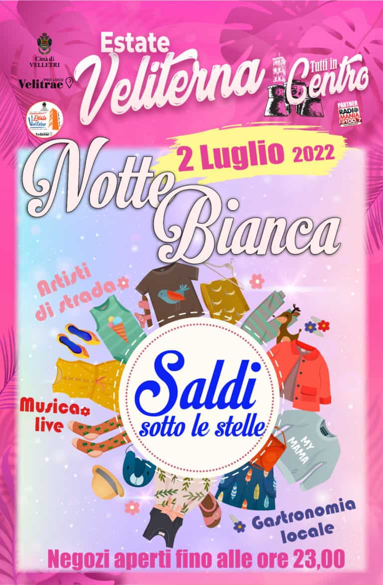 Nella ricca estate di Velletri, con tantissime attività messe in campo da cittadini, privati, associazioni, Pro Loco e Comune, non può mancare la “Notte Bianca”. Sabato 2 luglio, infatti, la città resterà “sveglia” fino a tardi grazie all’impegno dei commercianti in collaborazione con il Comune di Velletri.