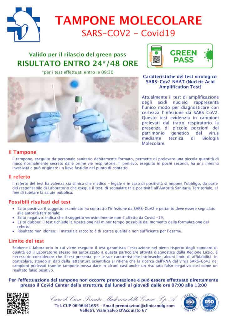 Presso la Casa di Cura “Madonna delle Grazie” sarà attivo, a partire da lunedì 21 febbraio 2022, il nuovo servizio di tamponi molecolari, validi per il rilascio del Green Pass. Il test molecolare è attualmente l’unico modo per diagnosticare con certezza l’infezione da SARS CoV2 evidenziando, nei campioni prelevati dal tratto respiratorio la presenza di piccole porzioni del virus attraverso tecnica di Biologia Molecolare. Il servizio di tamponi rapidi e semi-quantitativi procederà regolarmente con le modalità già indicate. Il servizio tamponi molecolari sarà operativo, presso il Covid Center della Casa di Cura dal lunedì al mercoledì dalle ore 7:00 alle 13:00 ed il giovedì dalle ore 7:00 alle 9:30. Non occorre la prenotazione.