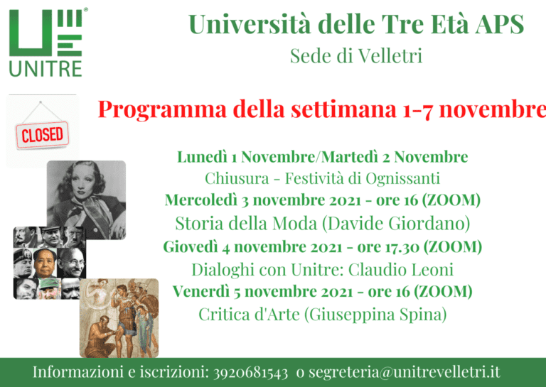 • La settimana che si apre con la Festa di Ognissanti vedrà l’Università delle Tre Età di Velletri osservare due giorni di chiusura, nello specifico lunedì 1 novembre e martedì 2 novembre. Si riprende mercoledì con il consueto calendario didattico, che prevede due lezioni, un incontro con l’autore e il laboratorio di informatica, appuntamento fisso del sabato.
