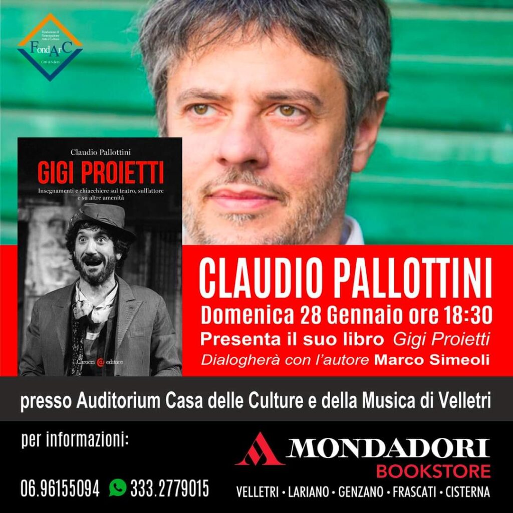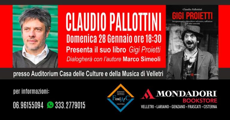 Claudio Pallottini presenterà a Velletri il suo nuovo libro “Gigi Proietti. Insegnamenti e chiacchiere sul teatro, sull’attore e su altre amenità”, edito da Carocci editore. L’appuntamento è per domenica 28 Gennaio alle ore 18.30 presso l’Auditorium “Romina Trenta” della Casa delle Culture e della Musica di Velletri in Piazza Trento e Trieste. L’autore sarà ospite della Libreria Mondadori Bookstore Velletri. Ingresso libero. Per informazioni 0696155094 / 3332779015.