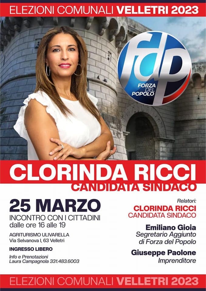 L’avvocatessa Clorinda Ricci, il 25 marzo dalle 16 alle 19, incontra i cittadini per presentare la propria candidatura a Sindaco di Velletri. A sostenerla la lista FDP, Forza del Popolo, che dunque correrà per le Comunali. Nell’incontro, a cui parteciperanno il segretario di FDP Emiliano Gioia e l’imprenditore Giuseppe Paolone, sarà presentata la candidatura. L’appuntamento è all’agriturismo Ulivarella in via Selvanova.
