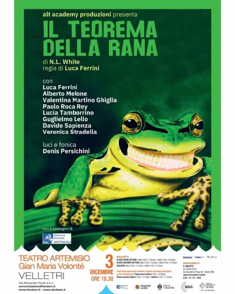 • Dopo i due sold out con Antonio Rezza per la prima e con il trio composto da Giorgio Lupano, Attilio Fontana e Gabriele Pignotta per la seconda, continua la stagione di prosa 2023-2024 al Teatro Artemisio-Gian Maria Volonté di Velletri. Domenica 3 dicembre, alle 18.30, terza data della programmazione messa a punto dalla Fondazione di Partecipazione Arte & Cultura Città di Velletri, diretta da Giacomo Zito, con il patrocinio di Ministero della Cultura, Regione Lazio, Comune di Velletri e la collaborazione dell’ATCL. In scena “Il teorema della rana”, un’altra commedia imperdibile.