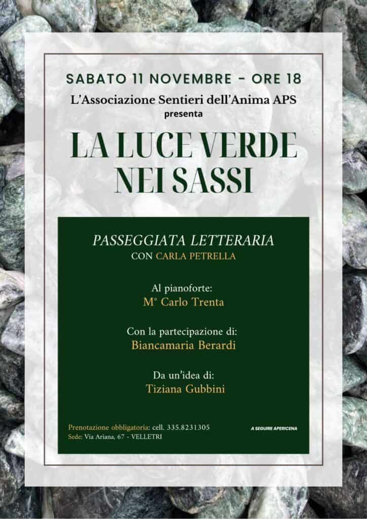 Sabato pomeriggio l’associazione Sentieri dell’Anima APS ha proposto un evento culturale dal titolo: “La luce verde nei sassi”. Carla Petrella e Carlo Trenta hanno accompagnato i presenti in una passeggiata letteraria che ha evidenziato lo stretto legame tra Natura e Uomo, un legame che si traduce poi in “favole scritte” e continuo humus d’ispirazione per poeti e scrittori. Dunque tanti sassi e tanti alberi dove il verde sembra accendere perfino l’indefinito e anonimo colore delle pietre che invece sono “vive e calde”. Seguendo così ogni piccolo passo, Carla Petrella ha letto le poesie di J. Saramago, D. Attanasi, J. Hierro, H. Hesse, P. Volponi, W. Szymborska, M. R. Stern, M. Jenca, M. Lanciotti, K. Bhati, V. Amichai, V. Paolicelli. Carlo Trenta ha suonato brani di G. Verdi, W. Mertens, R. Anzovino, R. Vinciguerra, G. Allevi.