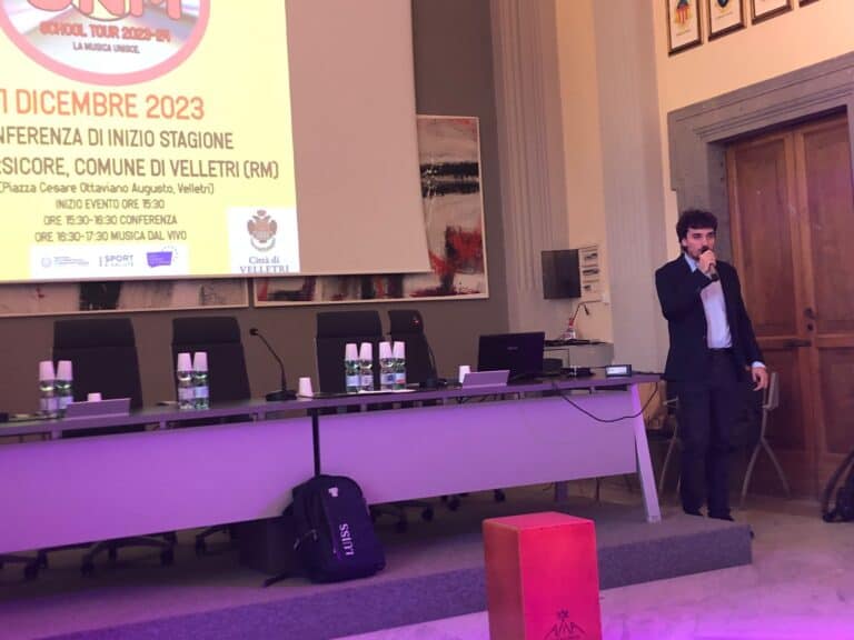Venerdì 1 dicembre 2023, nella splendida cornice della Sala Tersicore del Comune di Velletri, si è svolta la Conferenza di inizio stagione 2023-24 del progetto Operazione Nostalgia Musicale School Tour fondato dal cantautore e speaker radiofonico veliterno Giuseppe “Konsel” Consoli. E non è stata solamente una conferenza ma una vera e propria conferenza-spettacolo, come Giuseppe desiderava fare da diversi anni. Ha aperto la conferenza Riccardo Caponi, referente del progetto MIS (Multicentro dell’Inclusione e dello Sport), che ha dichiarato: “Il nostro progetto è volto a creare luoghi di aggregazione e situazioni di socializzazione per i ragazzi tra i 14 e i 34 anni. La musica è messaggera di concetti molto importanti in questo senso, perché permette di unire e far socializzare i ragazzi e di lasciarli meno soli. Giuseppe, inoltre, è un massimo esponente del potenziale della gioventù veliterna, e noi crediamo nel potenziale dei giovani”. Sono seguiti poi, alcuni interventi istituzionali da parte del Vice Sindaco Chiara Ercoli, dell’Assessore Ilaria Neri e del Consigliere Comunale Emanuele Rosatelli. Tutti e tre hanno posto l’accento sul binomio musica-giovani e di quanto sia importante proporre alla comunità progetti di questo genere.