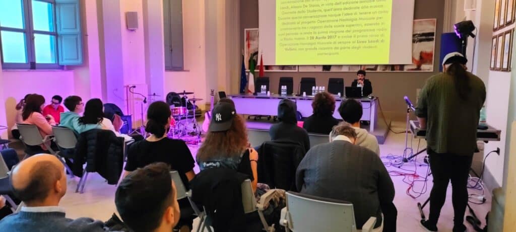 Dopo gli interventi istituzionali, Giuseppe Consoli ha raccontato attraverso delle diapositive la storia del programma radio di Operazione Nostalgia Musicale, recentemente tornato in onda su Radio Mania 100.7 dopo due stagioni a Radio Kaos Italy. Proprio in rappresentanza di Radio Mania è salito sul palco il direttore Leonardo Di Silvio, che ha elogiato pubblicamente Giuseppe e il progetto ONM: “Sono davvero felice di aver continuato questo percorso in radio con Giuseppe perché l’ho seguito anche nelle scuole sia nel momento in cui c’era l’aula piena sia nel momento in cui ci siamo trovati in quattro, e in ogni caso sia che fossimo in 4 o in 400, lui ci ha messo sempre lo stesso spirito: ha fatto la presentazione anche per 4 persone, e pochi hanno il coraggio di fare una cosa del genere, con la stessa professionalità e con lo stesso amore. Ho toccato con mano come presenta le cose, come le dice, racconta aneddoti, dei pezzi di storia. ONM è un viaggio che ci porta alla scoperta di tante cose: musicali, in modo leggero ma con tanta informazione all’interno”.