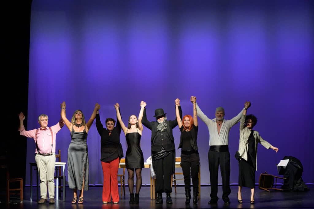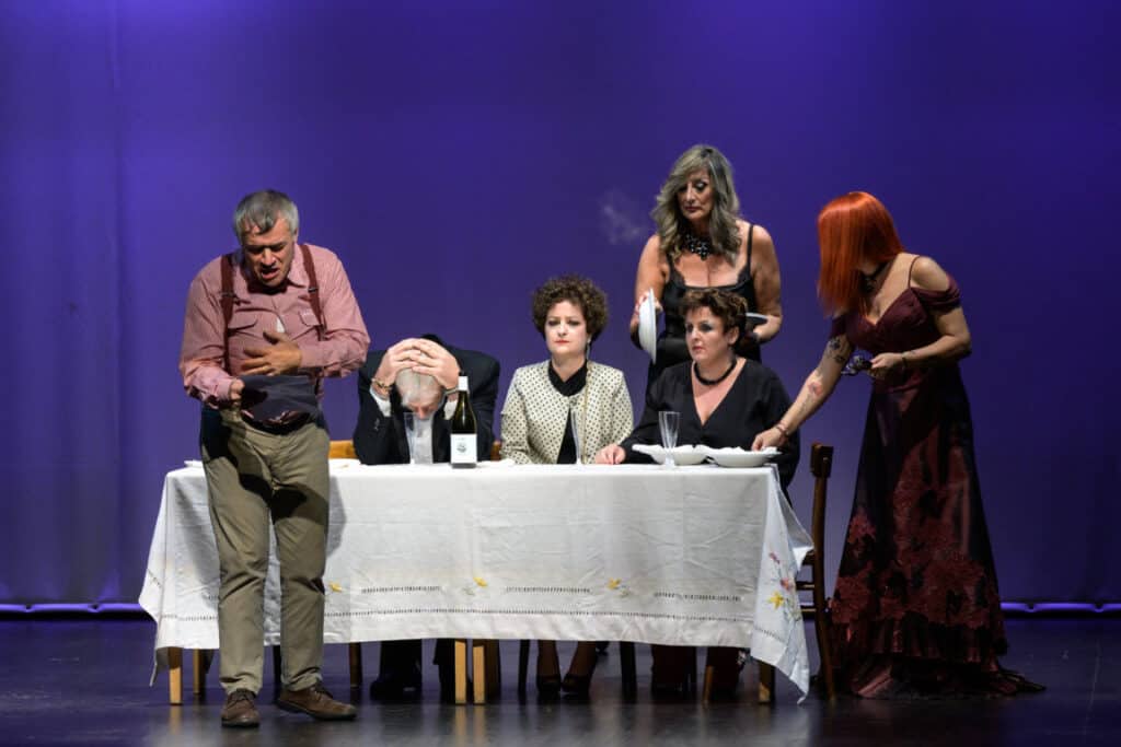A seguire è andata in scena “Crimini e portate” di Antonello Coggiatti, opera vincitrice del 2022. La rappresentazione è stata curata dall’Associazione Sentieri dell’Anima di Velletri per la regia di Luigi Pisani e David Gallarello e ha visto in scena Fabiana Ariano, Stefania Donati, Alessandra D’Elia, Arianna D’Ottavi, Giuseppe Russo e Carlo Carones. L’opera narra di una cena particolare in un luogo indefinito e inquietante. Protagonisti una governante enigmatica, quattro commensali irrequieti, una cameriera sensuale e un unico quesito per il pubblico: “chi sarà stato a organizzare tutto?”. Questi gli ingredienti di un grottesco giallo interattivo dai tratti surreali e dalle sfumature ironiche.
